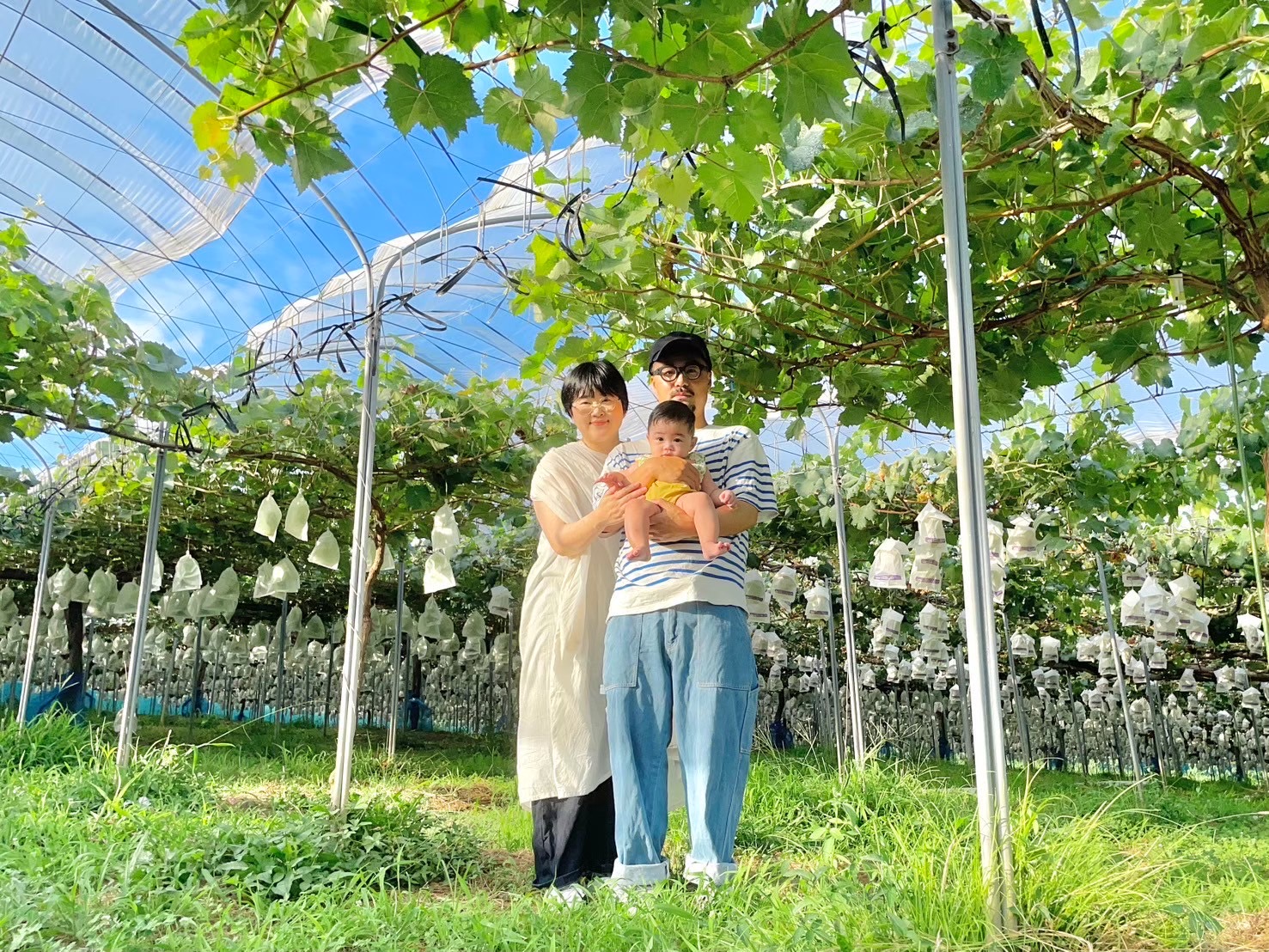 除草剤を一切使わず、息子・朔太郎が裸足で走り回れる健やかな土で育むのは、家族の愛そのもの。そうして実った一房を、長年の経験を持つ母の厳しい眼で選び抜き、妻・みかるがお客様への真心込めて包み込む。山田家三世代の情熱が重なり、全員が胸を張って「最高」と認めた一房だけを、皆様の元へお届けします。